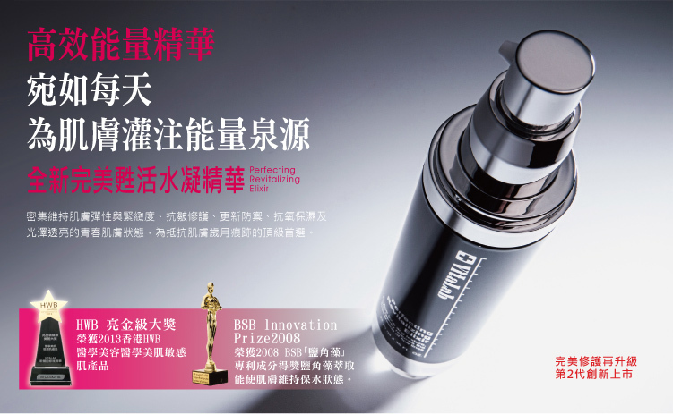 完美甦活水凝精華 Perfecting Revitalizing Elixir 榮獲2013香港HWB醫學美容醫學美肌敏感肌產品亮金級大獎。