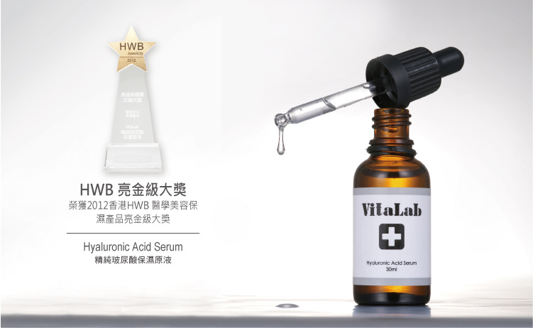 精純玻尿酸保濕原液 Hyaluronic Acid Serum 榮獲2012香港HWB醫學美容保濕產品亮金級大獎。